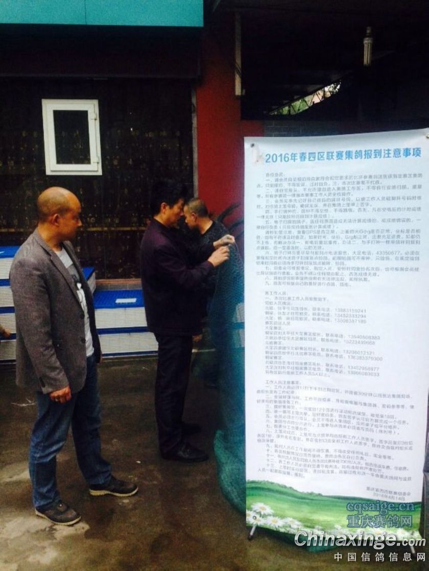 作品说明: 2016渝西四区春季联翔陕西红花铺于今日早上7点开始在各赛区集鸽。各赛区集鸽报到注 意事项相关责任人、联络人、工作人员名单在重庆赛鸽网供参赛鸽友浏览。此次比赛由 重庆赛鸽网全程跟踪报道。请参赛鸽友关注重庆赛鸽网。大足区鸽协主席唐全东、北碚 区鸽协主席申泽奇、铜梁区鸽协主席夏元国都在相关赛区坐镇指挥,身先士卒,根据流 程全程处理辖区集鸽上笼。重庆市鸽协副主席张平担任本次大赛司放裁判长。重庆赛鸽 网预祝本次大赛圆满成功!