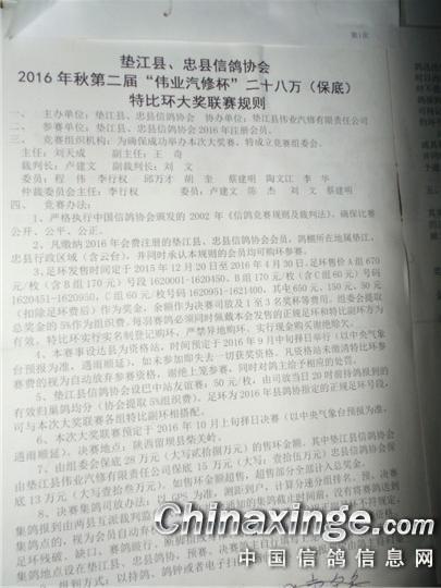 重庆垫江2016年秋季竞翔号角阵阵,时节“白露”已过,昔日的暑气已经退去,早晚天气忽凉忽凉的。晨雾时常笼罩巴渝大地,给赛鸽比赛带来一定影响。在中国第32个教师节之际,2016年9月10日下午到晚上重庆市忠县、垫江县信鸽协会二届伟业杯特比环达州资格赛集鸽了。