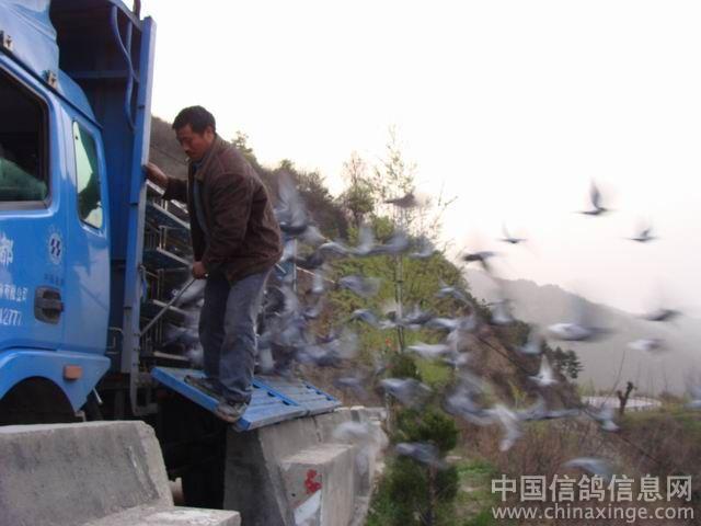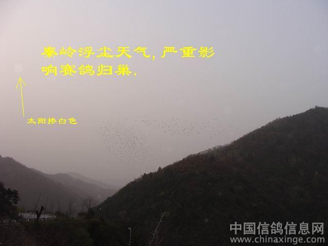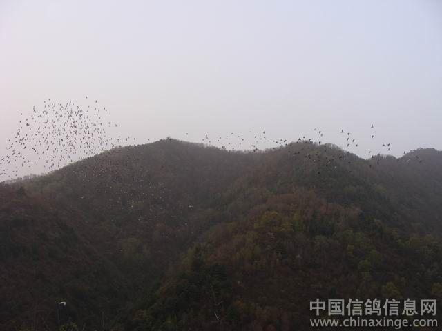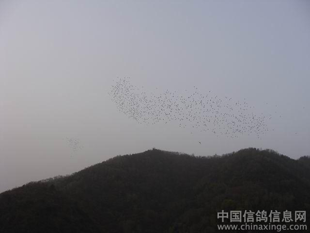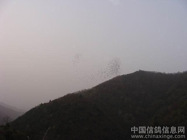 作品说明: 秦岭山上鸽群飞舞 2010年4月27日6时30分,陕西省凤县天气晴好,气温突然升高。兰州沙尘后浮尘弥漫秦岭山脉。成都铁路局火车头信鸽协会垫江分会组织的,重庆市渝东部分区县铁路系统2010年春季统一的陕西凤县400公里级别特比环和通讯赛决赛于6时30分开笼。特比环50元组,长寿赵成华茶馆集鸽,共18组x250=4500加3x50=150合计4650元,忠州支会21组x250=5250加3x50=150合计5400元,垫江16750加8x50=400合计17150元,总计27200元,特比环大奖赛和成鸽100元/单羽;200元/每组(3羽)伯马制赛。集鸽1000羽左右。 司放时间:2010年4月27 日6时30分 放飞点GPS测经度:33°:54”: 放飞点GPS测纬度:106°:31”: 司放地:陕西省凤县酒奠梁 空距:400公里左右 司放员:文川(垫江县)、冉龙福(万州区) 27日21时特比环, 成都铁路局火车头信鸽协会垫江分会(垫江)归巢27羽、(忠县支会)1羽、(长寿赵成华茶馆)9羽。受浮尘影响,通讯赛和特比环总的当日归巢在10%左右。