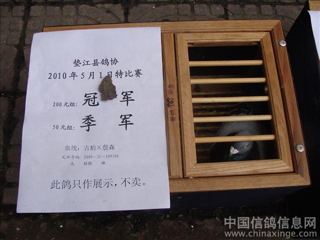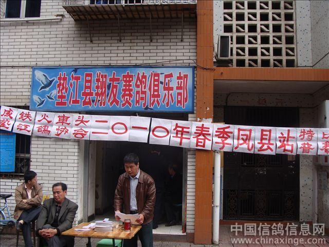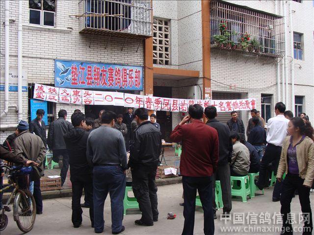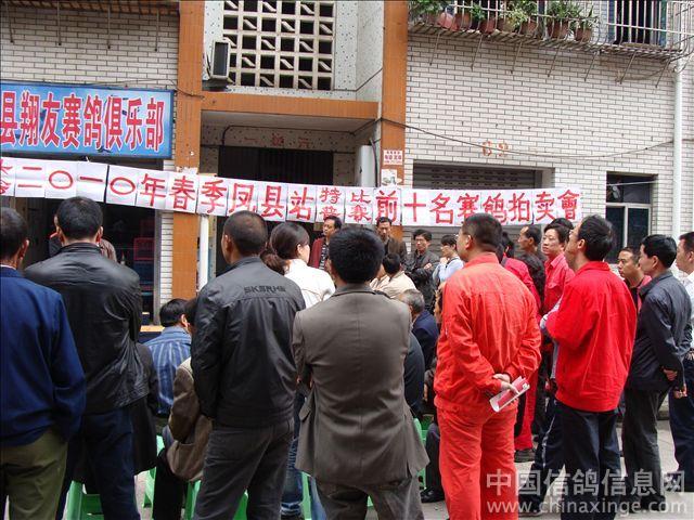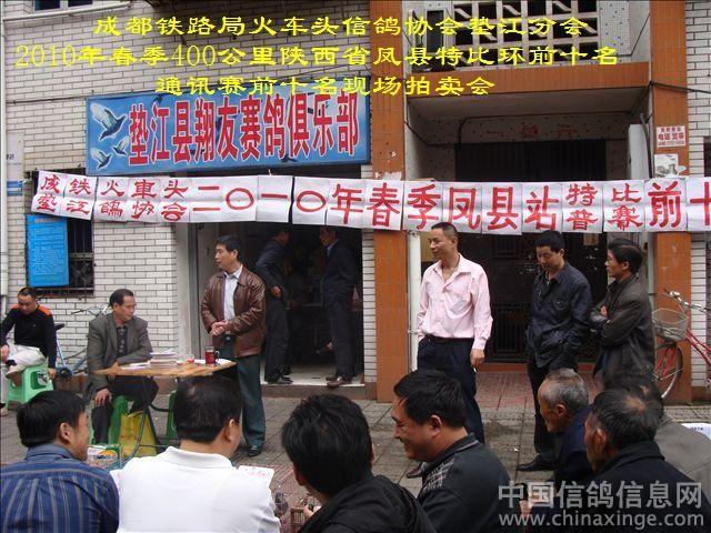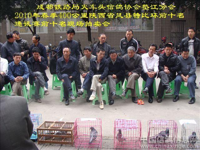 作品说明: “坝坝拍卖会”重现重庆渝中垫江 没有豪华的会场,没有豪华的桌椅,没有绚丽的音像。这里有激情、有追求、有梦想、有付出、有回报。二〇一〇年五月八日,这个民间“吉祥日——我发”,星期六上午9时至12时。成都铁路局火车头信鸽协会垫江分会,在重庆市垫江县桂溪镇铁水桥二公司后门——垫江翔友赛鸽俱乐部。在平坦的公路坝坝(称坝坝拍卖会)和清茶的相伴下,以及鸽友的激情。扑克牌当拍卖锤。在去年拍卖的基础上,又再次举行了别开生面的2010年春赛特比环和通讯赛陕西凤州400公里4月27日,归巢的前10名获奖鸽举行拍卖。外地(忠县等地)的鸽友前来参与拍卖交流。   这次拍卖会,所有获奖鸽均已拍出,一年之后,渝中山区的垫江县“坝坝拍卖会”拍卖竟然拍出了“公棚”鸽价位。垫江特比环冠军以4000元拍出。   在渝中这样的山区县举行拍卖会,表现出多数垫江县鸽友有不愿意把自己的成绩拍卖出去,均以600~1200元价位拍回。这样让外地来的鸽友有些尴尬,请谅解。拍卖会圆满成功!会后成都铁路局火车头信鸽协会垫江分会在《骑龙火锅》举办了四桌火锅答谢参加拍卖会的部分会员和外地鸽友,极少数未交2010年会费的鸽友也冒昧参加了“火锅宴”。今后在这里,俱乐部、县信鸽协会、火车头信鸽协会将会举办更多拍卖会来促进赛鸽交流,引进外地优秀赛鸽注入垫江,同时希望垫江鸽友应该不吝啬地把优秀赛鸽支援给外地来垫江县引种的鸽友。